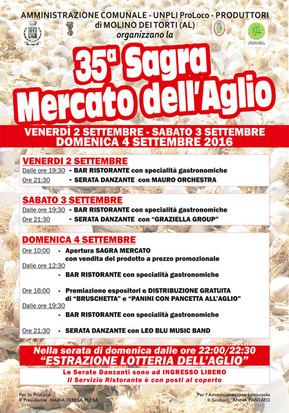 Questa località è rinomata soprattutto per la qualità del suo aglio, considerato tra i migliori in circolazione. Il tutto garantito dai metodi usati dai produttori di Molino i quali non hanno mai abbandonato le tecniche tradizionali e, nel corso degli anni, il loro prodotto si è guadagnato un posto di rilievo sul palcoscenico nazionale. Le tecniche di coltivazione prevedono ancora oggi l’esercizio manuale di buona parte delle operazioni colturali che lo rendono unico sia nelle dimensioni del bulbo che nella colorazione particolarmente bianca della pelle. Le varietà coltivate a Molino sono due: il “Borgognone” o “Ravagno” che si raccoglie verso giugno che è particolarmente adatto nelle insalate, crudo verde, la cui durata e la freschezza del bulbo è limitata mentre l’aglio classico di Molino dei Torti viene raccolto a luglio e dopo un periodo di essiccazione al sole, rivoltato giornalmente per arieggiarlo, viene confezionato in mazzi che possono essere conservati (al fresco) sino all’anno successivo.