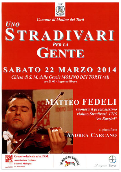 Sabato 23 marzo, nella Chiesa S.Maria delle Grazie di Molino dei Torti, il Maestro Matteo Fedeli, accompagnato al pianoforte dal Maestro Andrea Carcano ha affascinato il pubblico presente con le note del prezioso violino: lo Stradivari ex Bazzini 1715. Grande soddisfazione per l’amministrazione comunale che ha patrocinato il concerto e per il numeroso pubblico presente che, con calorosi e ripetuti applausi, ha dimostrato di aver apprezzato molto l’esibizione dei due maestri. I commenti al termine della serata sono stati entusiastici. Per il nostro paese è stato un concerto straordinario: il suono che questo strumento è in grado di produrre e la sua bellezza estetica ne fanno un oggetto d’arte per l’arte. Aver avuto la possibilità di ascoltare attraverso le mani di un musicista esperto come il Maestro Matteo Fedeli questo violino è stato un grande privilegio.