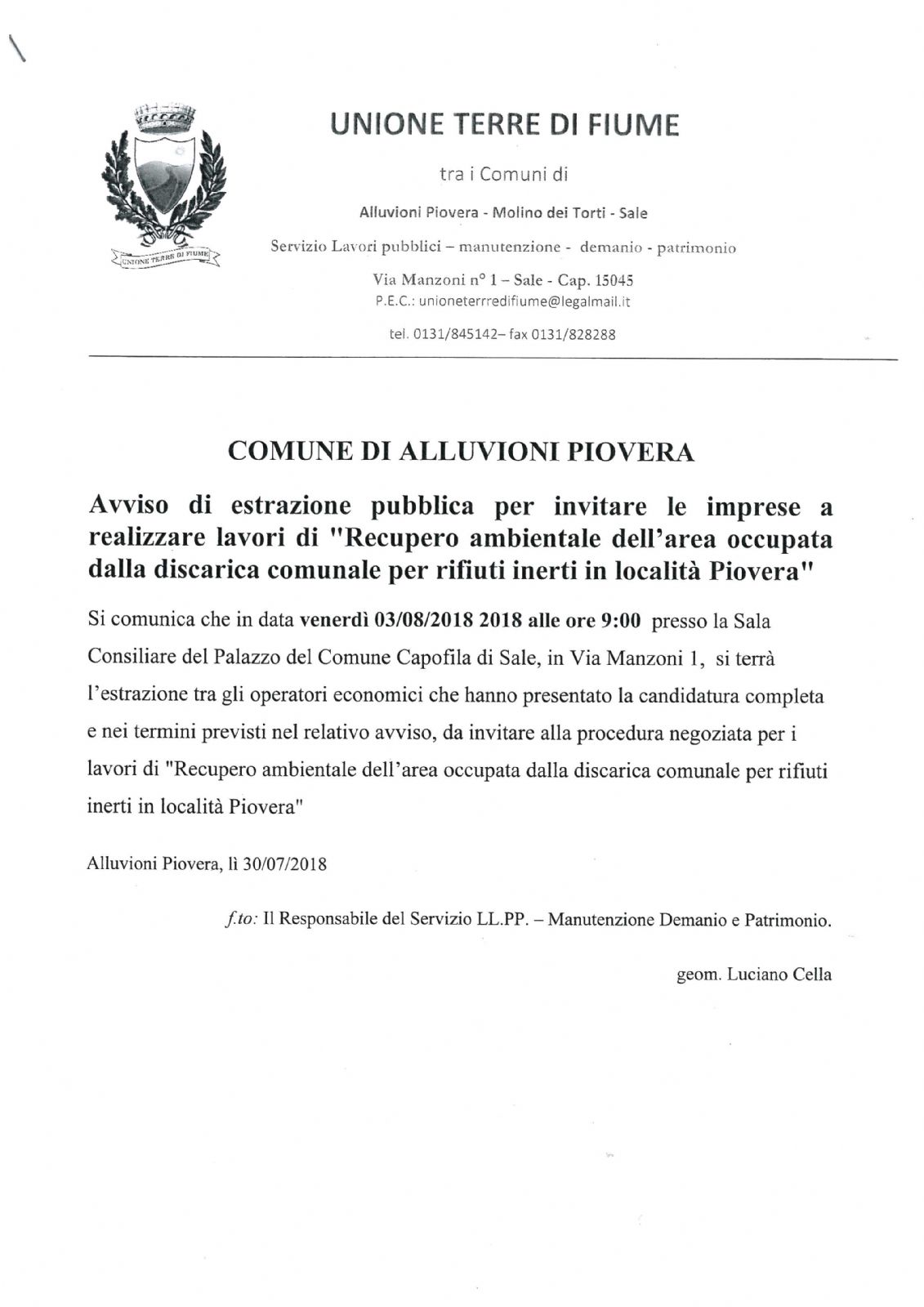 Si comunica che in data venerdì 03/08/2018 2018 alle ore 9:00 presso la Sala Consiliare del Palazzo del Comune Capofila di Sale, in Via Manzoni 1, si terrà l’estrazione tra gli operatori economici che hanno presentato la candidatura completa e nei termini previsti nel relativo avviso, da invitare alla procedura negoziata per i lavori di "Recupero ambientale dell’area occupata dalla discarica comunale per rifiuti inerti in località Piovera"