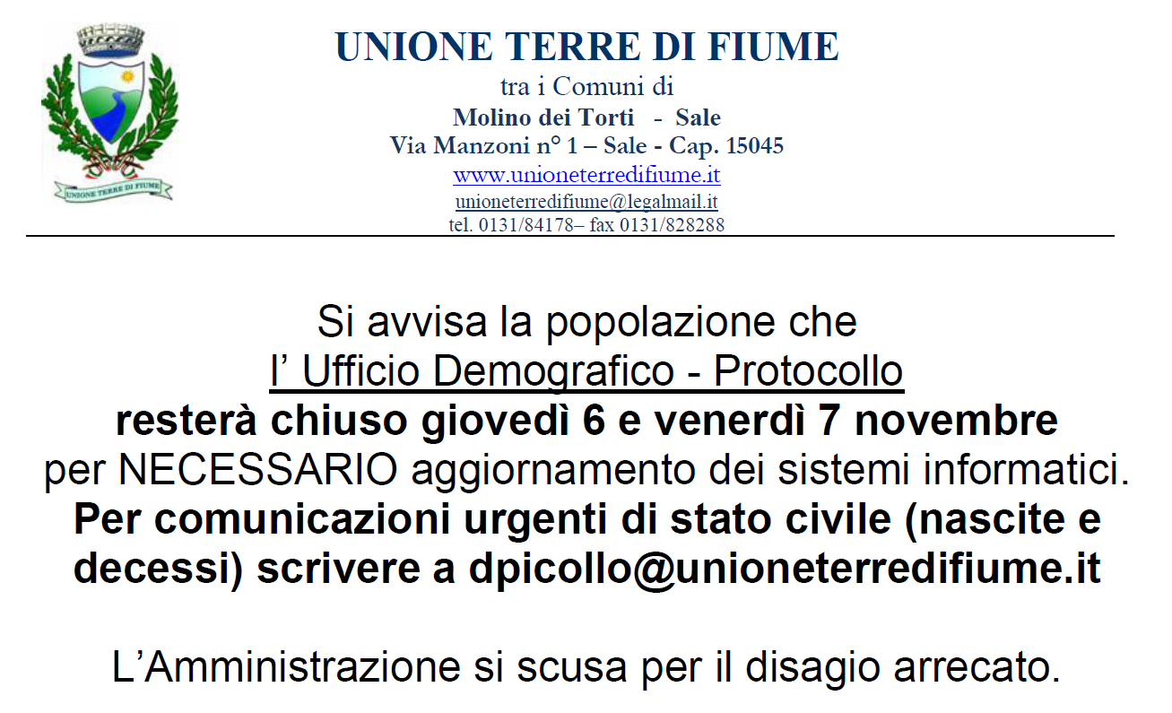 Si avvisa la popolazione che l’ Ufficio Demografico - Protocollo resterà chiuso giovedì 6 e venerdì 7 novembre per NECESSARIO aggiornamento dei sistemi informatici.